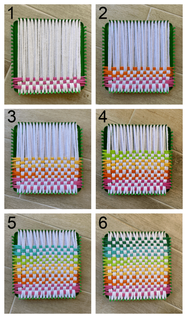 1 – Start from the bottom & push the metal weaving hook over & under loops, going from one side to the other. Attach a cotton loop to the hook & pull it back through. Secure the ends on the pegs. Weave the next row, going over & under opposite loops. Using this process, weave 3 rows of pink loops.