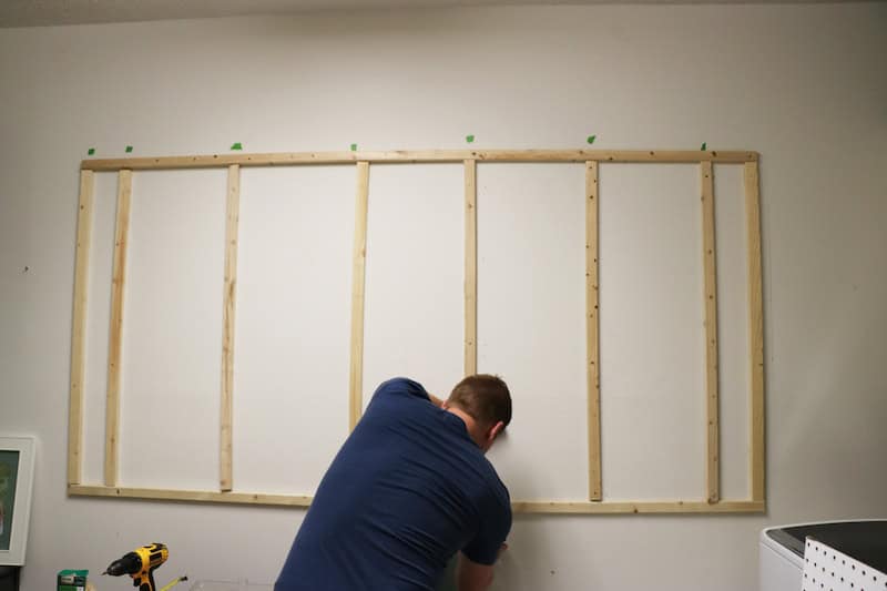 You can use both vertical and horizontal furring strips to create a frame for your pegboard, as shown below. (Don’t be distracted by the male in the photo. He’ll be golfing when you need him.)