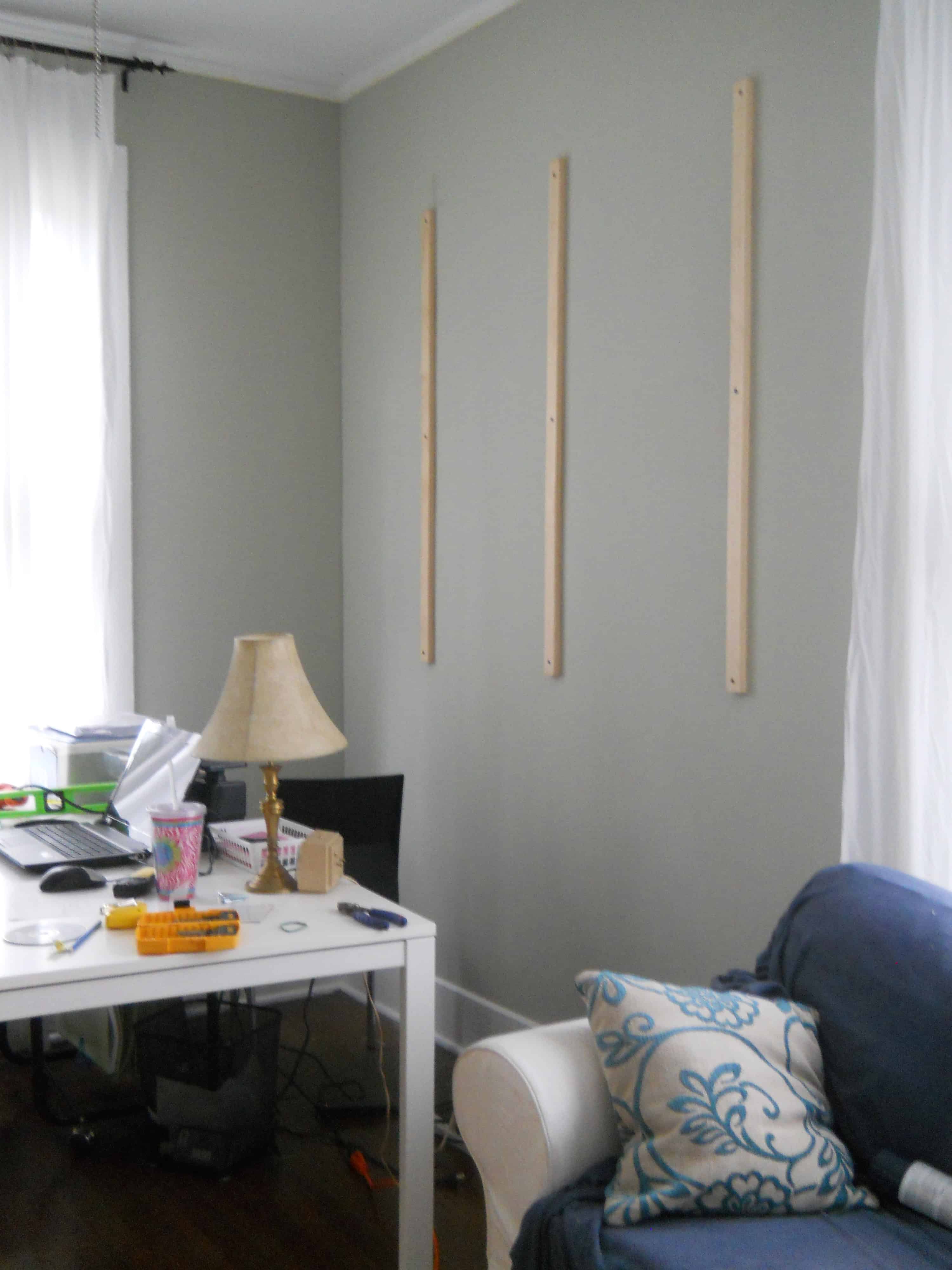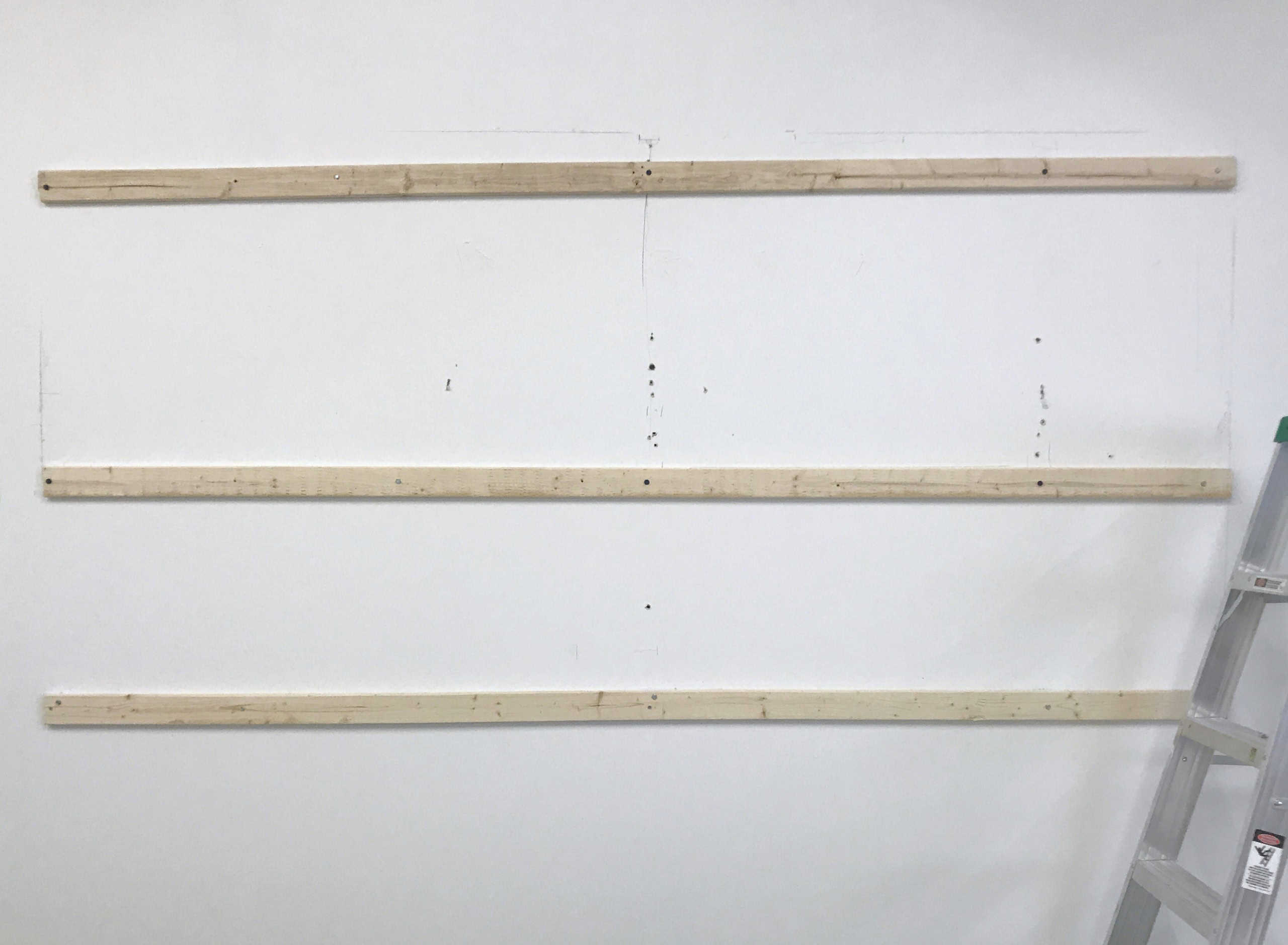 Using anything available to help prop the board up (I used a large fabric roll!), align it with the placement lines and screw it into a stud. If a 2 1/2″ wood screw attaches to the stud properly, you’re in business. Continue until all three strips are attached.