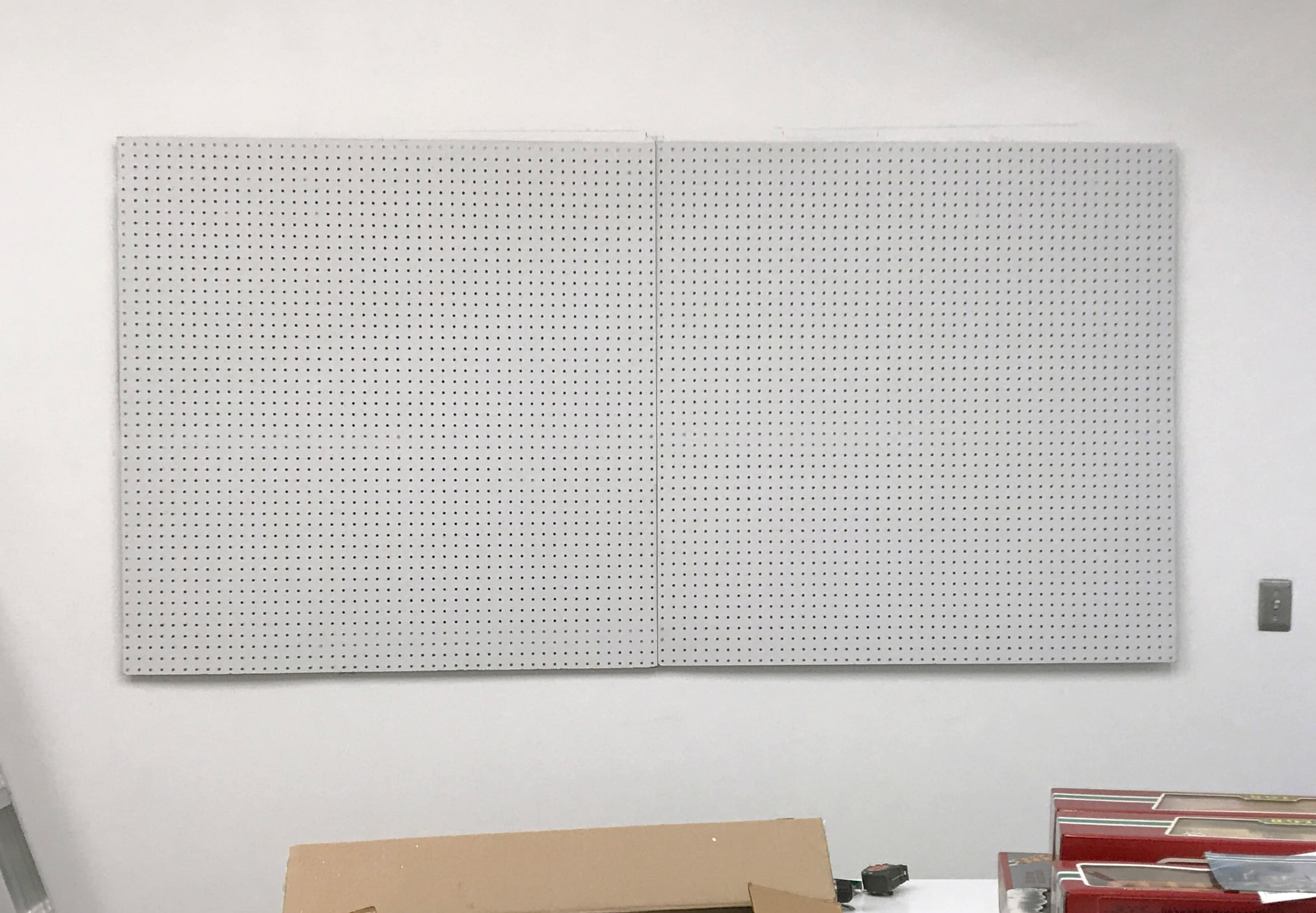 You will need a level (just download an app on your smartphone), screwdriver and 1/2″ wood screws for attaching the pegboard to the studs.